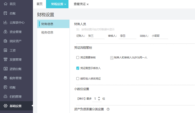 新增凭证的时候会显示制单人,打印的时候可以设置显示记账人、审核人和出纳,设置后打印出来的凭证上就会显示这些信息。基础设置-财税设置-财务信息界面操作设置: