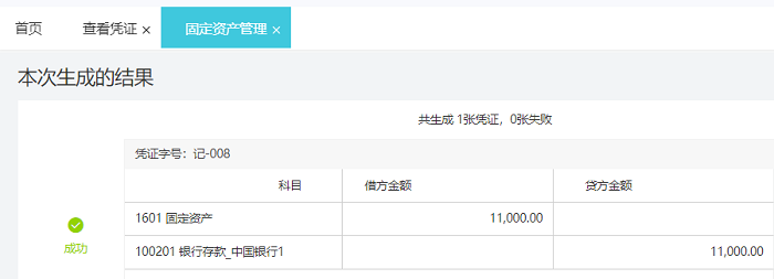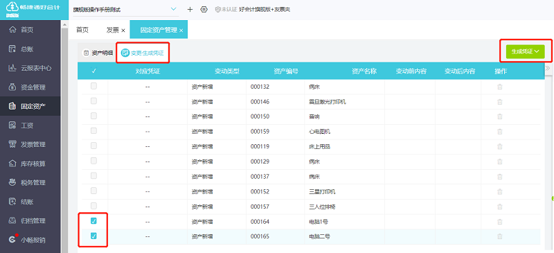 固定资产-固定资产管理-变更生成凭证,新增当月的固定资产全选,点击生成凭证;只有新增购买日期是当月的固定资产才可以在这个界面生成凭证,购买日期是录入月份之前的固定资产只能手工做凭证。