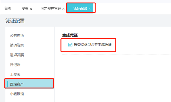 基础设置-凭证配置-固定资产,按变动类型合并生成凭证勾选上,保存,再去固定资产模块生成凭证。