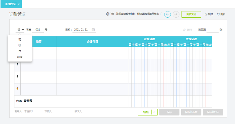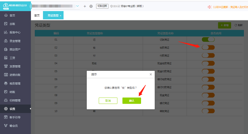 进入好会计-【设置】-【凭证类型】,点击收、付、现金凭证类型开通,进行保存开通即可。
