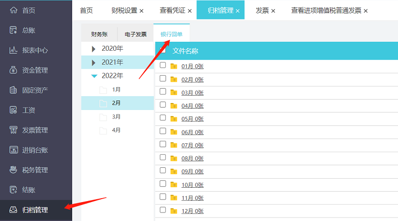 (2)日记账获取广发银行实时银行对账单后,在【归档管理】-【银行回单】可以归档广发银行电子回单。