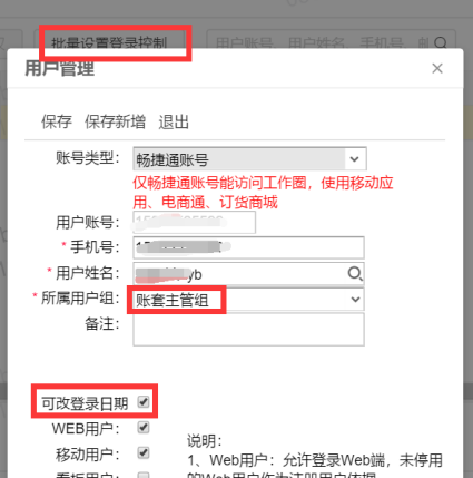 1. 登入日期权限需要在【系统管理】-【用户权限】中找到用户双击打开,也可以批量设置登入控制,把【可改登入日期】勾选方可登入时修改登入日期。