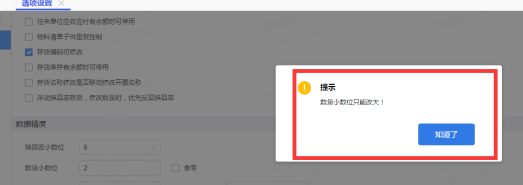 客户目前小数位设置的是3位小数点,想要改成2位,但是提示只能改大不能改小