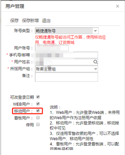 3、勾选该操作员进行移动应用授权的时候提示:手机号或邮箱不能为空,需要录入该畅捷通账号的手机号或者邮箱;