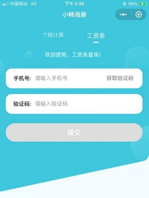 2、让员工用微信扫描二维码,手机屏幕会跳转至小畅涨薪小程序,选择【工资条】,员工自己填写手机号,输入验证码,点击提交即可。