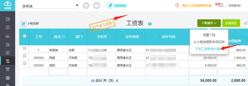 3、光标移至右上角【个税操作】,会出现一个下拉菜单,选择下发工资条到小程序;