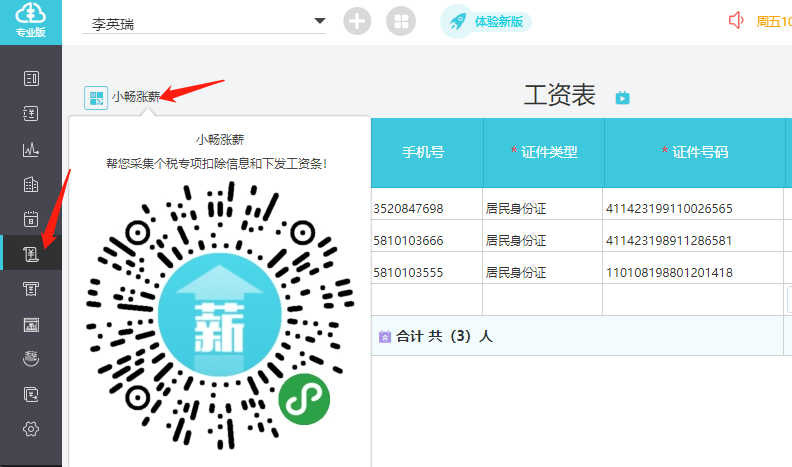 1、选择左侧菜单【工资】-【工资表】,进入工资表界面,光标移至左上角【小畅涨薪】,会出现一个小程序的二维码;