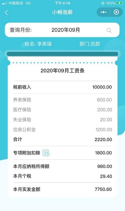 4、员工在手机小程序里,选择要查询的月份,即可查询自己的工资条,工资条上会显示工资收入、社保明细、专项附加扣除信息、个税及实发金额明细信息。