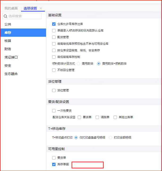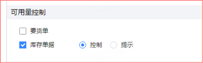 点击选项设置,然后点击可用量控制,勾选上库存单据,没有提示或者控制可以选择