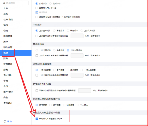 1、若产成品入库单生成凭证不需要显示成本明细,直接取消勾选产成品入库单显示成本明细选项。