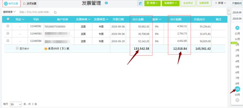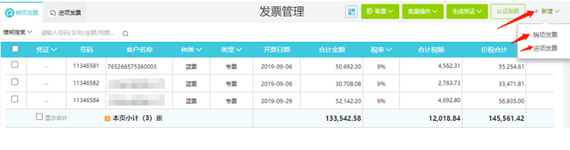 1、服宝公司(一般纳税人)2019年9月在发票管理-发票中通过手动新增销项发票和进项发票的方式的录入的销项、进项发票明细数据如下:
