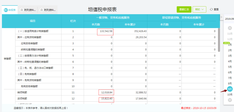 2、因此该企业2019年9月的增值税申报表自动生成如下: