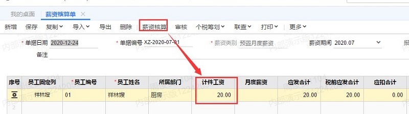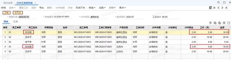 计件工资中已经生成了计件工资核算单,比如员工祥林嫂工资 20