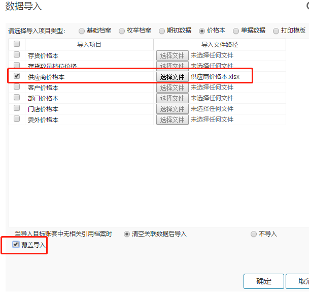3. 再点击系统管理-数据导入,选择价格本-供应商价格本,勾选覆盖导入