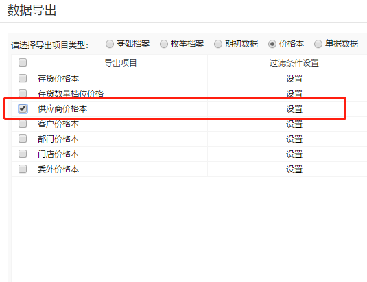 1. 点击系统管理-数据导出,选择价格本-供应商价格本