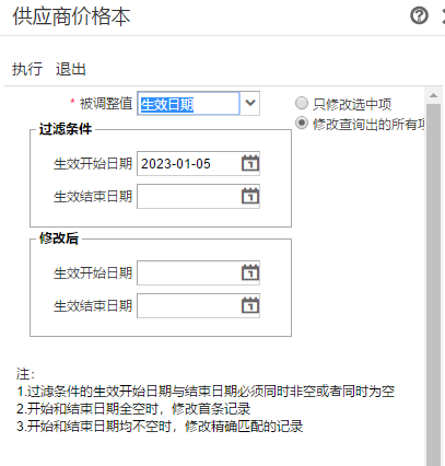 T+供应商价格本中设置了不同的生效开始日期和生效结束日期,想要批量修改供应商价格本中的结束时间