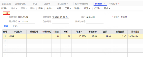 4. 再去重新选择请购单生成采购订单,可以看到此时的单价和请购单中的单价一致。