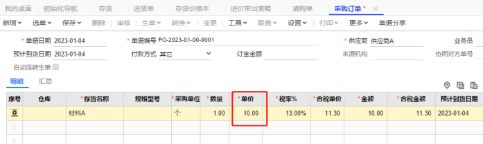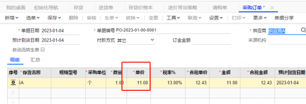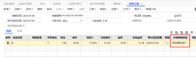 2. 再返回查看采购订单发现价格策略类型显示了存货最新进价