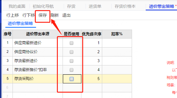 3. 如果需要按请购单中录入的单价来进行后续的采购,可以到基础设置-进价带出策略中取消勾选的进价带出来源后保存