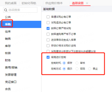 2、启用最高进价控制,点击“系统管理”—“选项设置”,打开采购的页签,将“最高进价控制”打上勾,设置控制时机和控制方式。