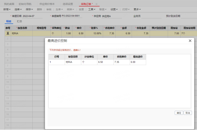 3、 在填制采购单据时,选择该供应商和存货,当单价高于设置的最高进价时,系统会自动弹出提示或者控制。