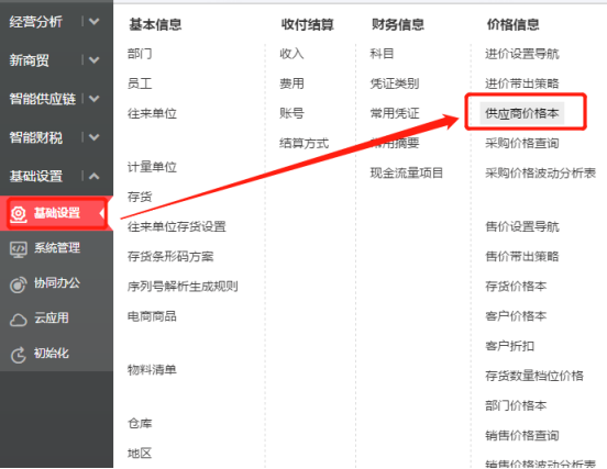 1、设置最高进价,点击“基础设置”—“进价价格管理”—“供应商价格本”,对供应商对应的存货设置好最高进价。