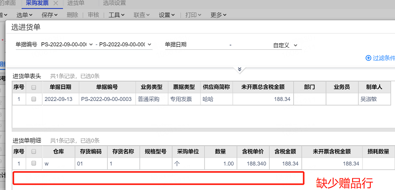 A公司使用发票立账,采购发票选进货单生成,当进货单表体有赠品行和非赠品行时,采购发票选进货单界面为什么不显示赠品明细?表头勾选显示赠品又不显示非赠品的存货明细行是什么原因呢?如何在选单界面赠品行明细和非赠品行明细都能体现出来呢?