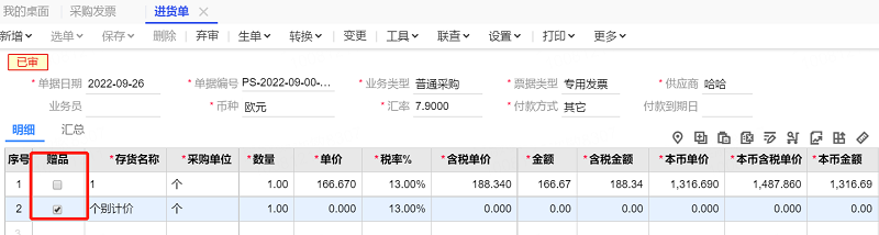 4、取消选单界面【赠品】字段显示,则出现赠品行和非赠品行明细。