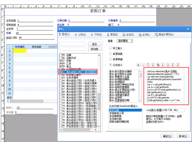 2、高级属性 - 公式定义,自定义取值,取表头订单日期+30天: