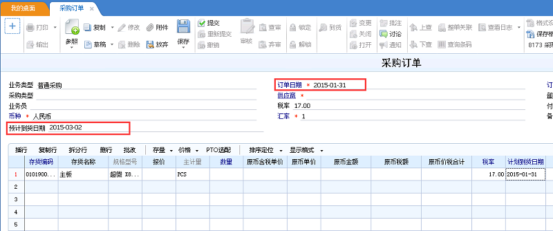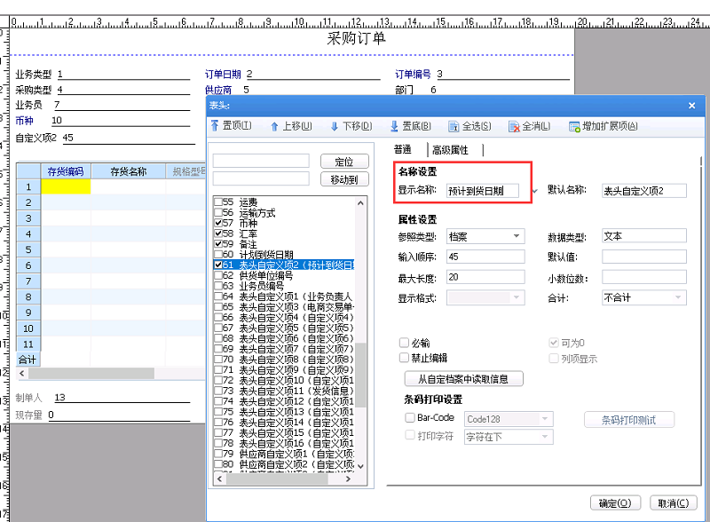 1、单据格式设置,使用表头自定义项,修改名称为“预计到货日期”;