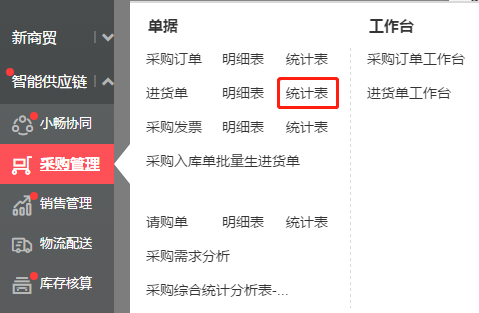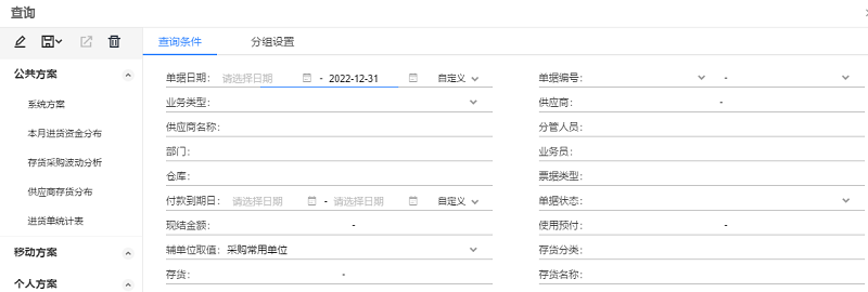 打开【采购管理】-【进货单统计表】的查询条件设置界面
