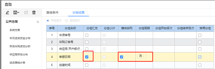2、打开上方的分组设置页签,勾选【单据日期】的【分组汇总】并设置按月进行横向排列