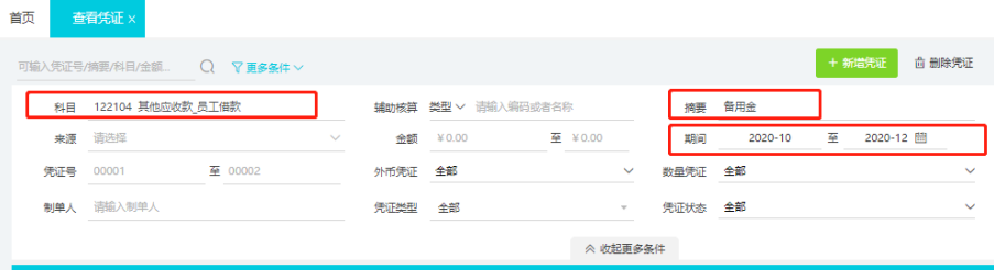 2.点击左上角的【更多条件】,依据模糊印象或做账习惯,输入可以确定的信息,缩小筛查范围,如:在摘要中输入备用金,选择其他应收款科目,时间选择最近3个月,就可以快速确认是否有支取备用金了。