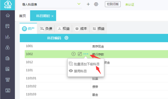 1. 进入【设置】—【科目期初】,找到银行存款科目旁边的【…】,点击【批量添加下级科目】;