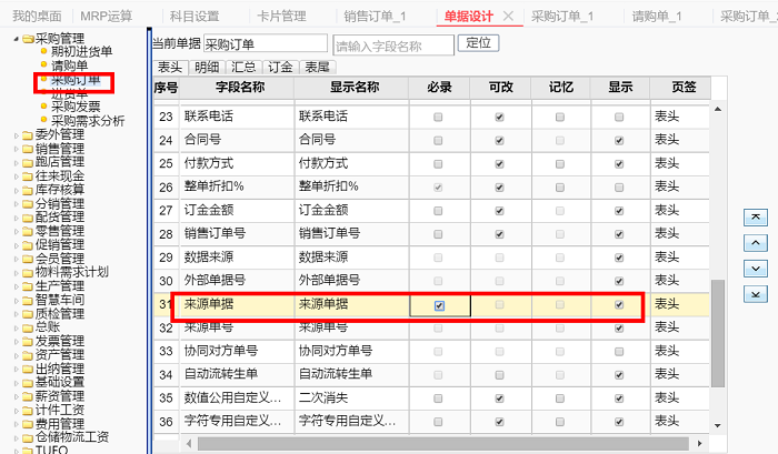 2、选择【采购管理】中的采购订单,把“来源单据”设置为必录