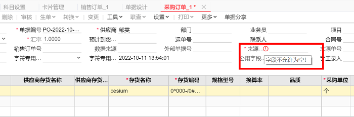 如果直接新增采购订单会保存不了,提示“字段不允许为空!”