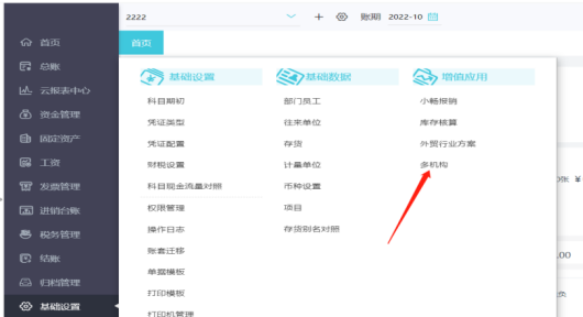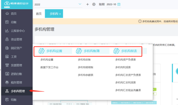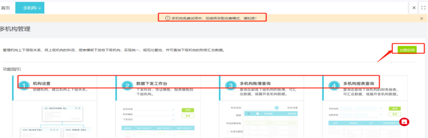 侧边菜单栏会增加【多机构管理】模块,里面包含多机构设置,多机构管理和多机构报表三个部分。从而实现查询总部或下级机构账簿或财务报表,可汇总数据,或展开各机构数据。