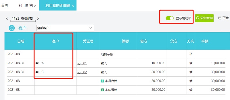分组查询针对多辅助核算使用,例如需要查询市场一部下分别A和B客户的余额和汇总金额