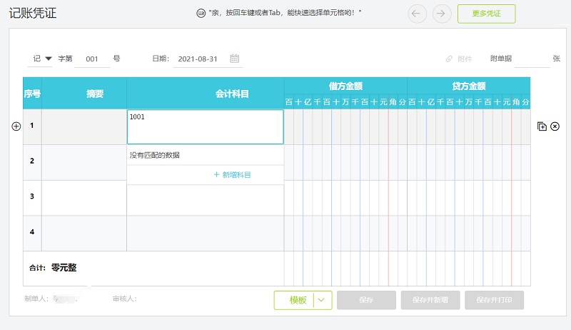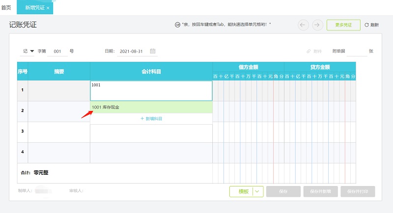 例如:在新增凭证时,需要选到库存现金科目,可是输入科目编码1001却没有此科目,科目根本选不到,如下图: