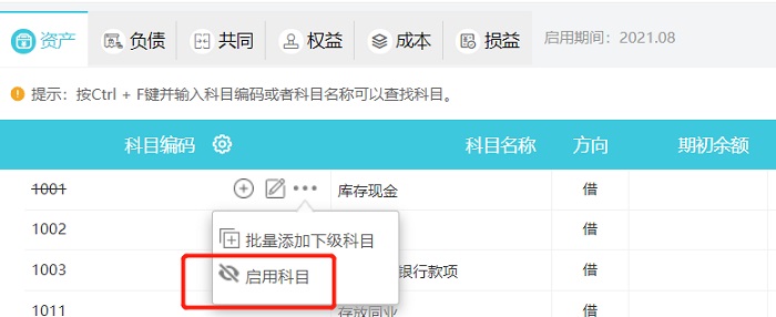 由上图可以看出,1001科目是常见科目,而且在科目期初是能看到的,但是为什么做凭证会选不到?应该思考是不是把这个科目禁用了,导致选不到,可以进入科目期初验证,点击【设置】-【科目期初】点击科目旁边的【...】下面的【禁用科目】,如下图,这个情况就是把库存现金科目给禁用了导致做凭证选不到这个科目