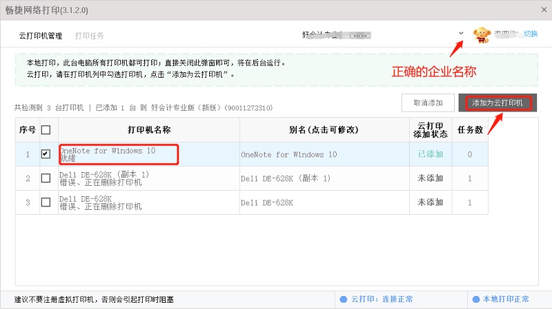 方式二:选择【云打印机】,需要输入软件的账户密码,选择正确的企业名称,将要打印机设置为网络打印机即可打印凭证,维护好这些信息后,插件自动运行到桌面的右下角,该优势既可要打印凭证也可以打印库存单据共同使用;