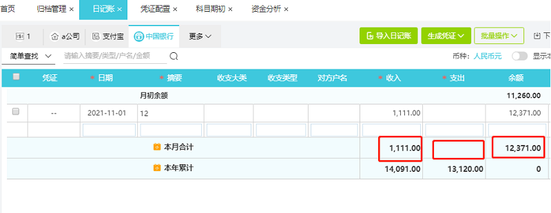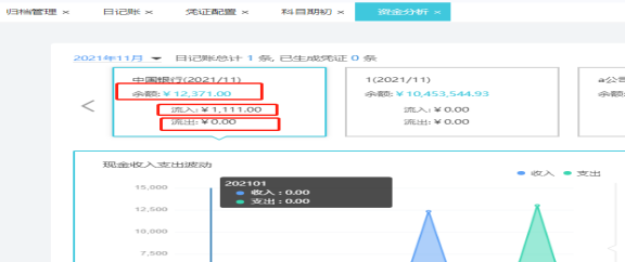 资金分析模块中的银行存款流入金额1111元=日记账中的银行存款收入金额1111元