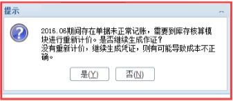 问题现象:用友畅捷通T+V12.1专业版的总账管理模块在生成凭证时,7月份生成凭证,提示2016年06月期间,存在单据未记账,请到库存核算重新计价。