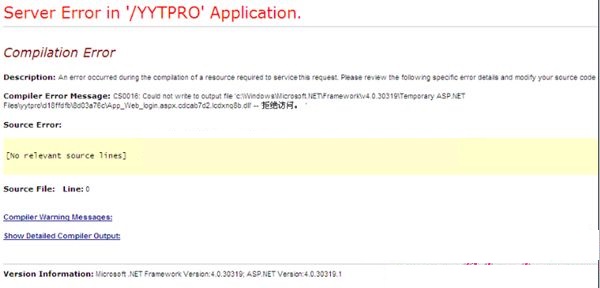 一开始是这么分析的:Server error in ‘/yytpro’ application 错误提示包括很多种情况,我们一般需要通过 compiler error 下面的英文信息来查看具体的问题,如上图所示看出应该是.NET安装路径下的缓存路径下一个临时的DLL控件拒绝访问了。此问题我们可以归集为:Temporary ASP.NET Files\yytpro\......\xxxxxx.dll – ‘拒绝访问。’
