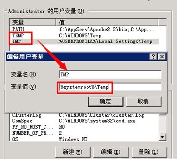 3、设置环境变量为 %SystemRoot%\Temp。右击“我的电脑”—“属性”,在“高级”页签点击“环境变量,点击“Temp”再点击“编辑”将“Temp”的值改为%SystemRoot%\Temp,点“确定”即可。如下图: