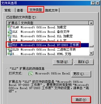 (2)点击“文件类型”,找到xls-Microsoft Office Excel 97-2003工作表,点击“高级”: