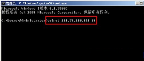 4、检测端口开放情况,使用telnet命令进行检测(telnet命令使用方法参考: telnet命令),如外网IP为111.78.110.161,开放的端口为98,那么可以在任意计算机使用telnet命令,telnet 111.78.110.161 98 ,如出现光标一闪一闪,表示端口开放成功,如果提示打开端口失败,请返回检查第2步和第3步是否操作成功,如下图所示为telnet命令运行过程: