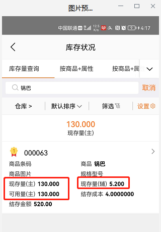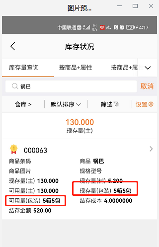 业务场景:销售商品:锅巴是多计量单位,1箱=25包,库存130包,手机端查看库存时需要能显示成多少箱多少包,方便进行查看。