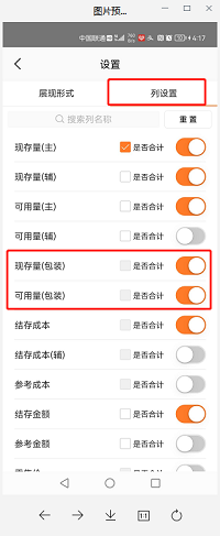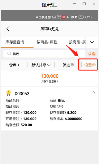 2. 手机端的查库存界面上,把【现存量(包装)】、【现存量(包装)】显示出来。点击查库存(库存状况)右上角的设置按钮。