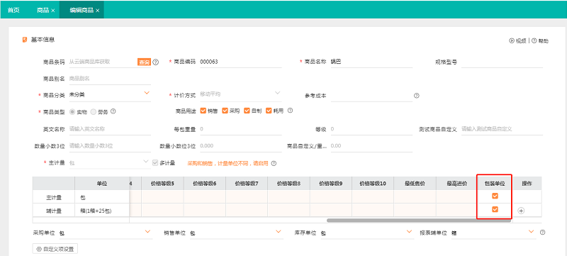 1. 检查商品档案上的【包装单位】的勾选情况。如果包装数量需要显示为多少箱多少包,那么包装单位需要同时勾选这两个单位,如下图: